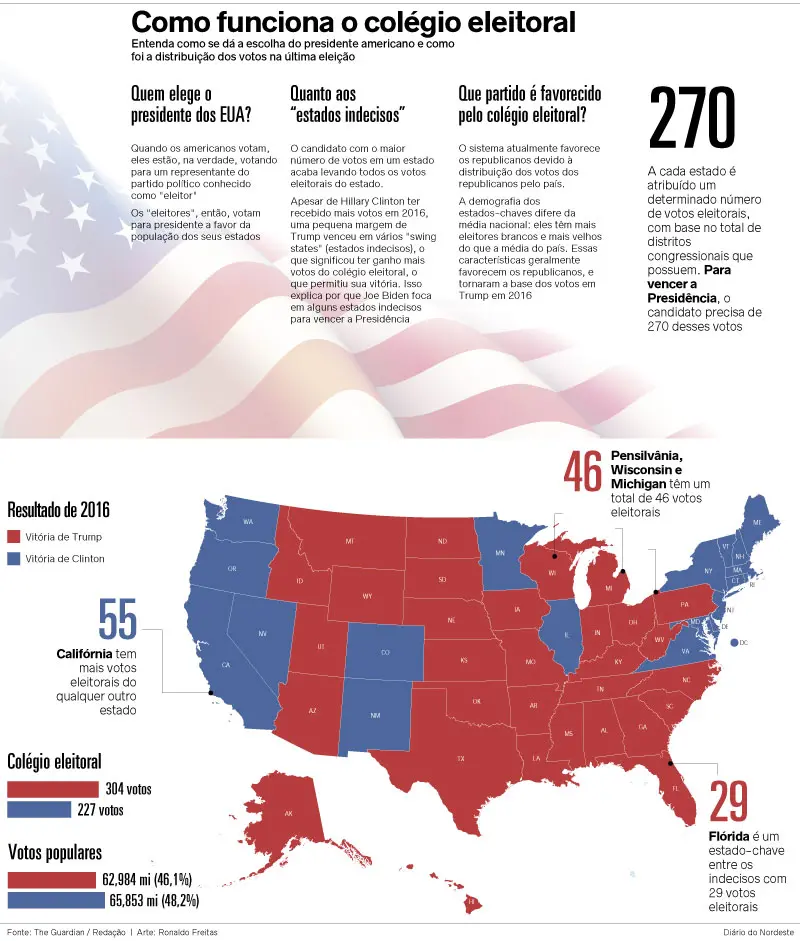 O pleito de hoje também vai escolher 35 senadores, 435 deputados federais, 11 governadores e 5.000 deputados estaduais. O sistema de votação é indireto, através do colégio eleitoral, com delegados que representam a população dos 50 estados. Há no total 538 votos no colégio eleitoral, e um candidato vence se tiver pelo menos 270 votos.