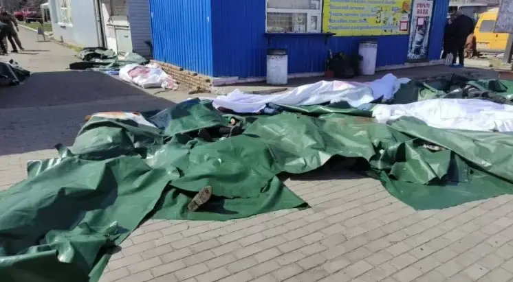 Ucrânia e os países ocidentais acusam os militares russos de "crimes de guerra" depois do aparecimento de dezenas de cadáveres, aparentemente civis assassinados com um tiro de arma de fogo, nas ruas de Bucha, a noroeste de Kiev.