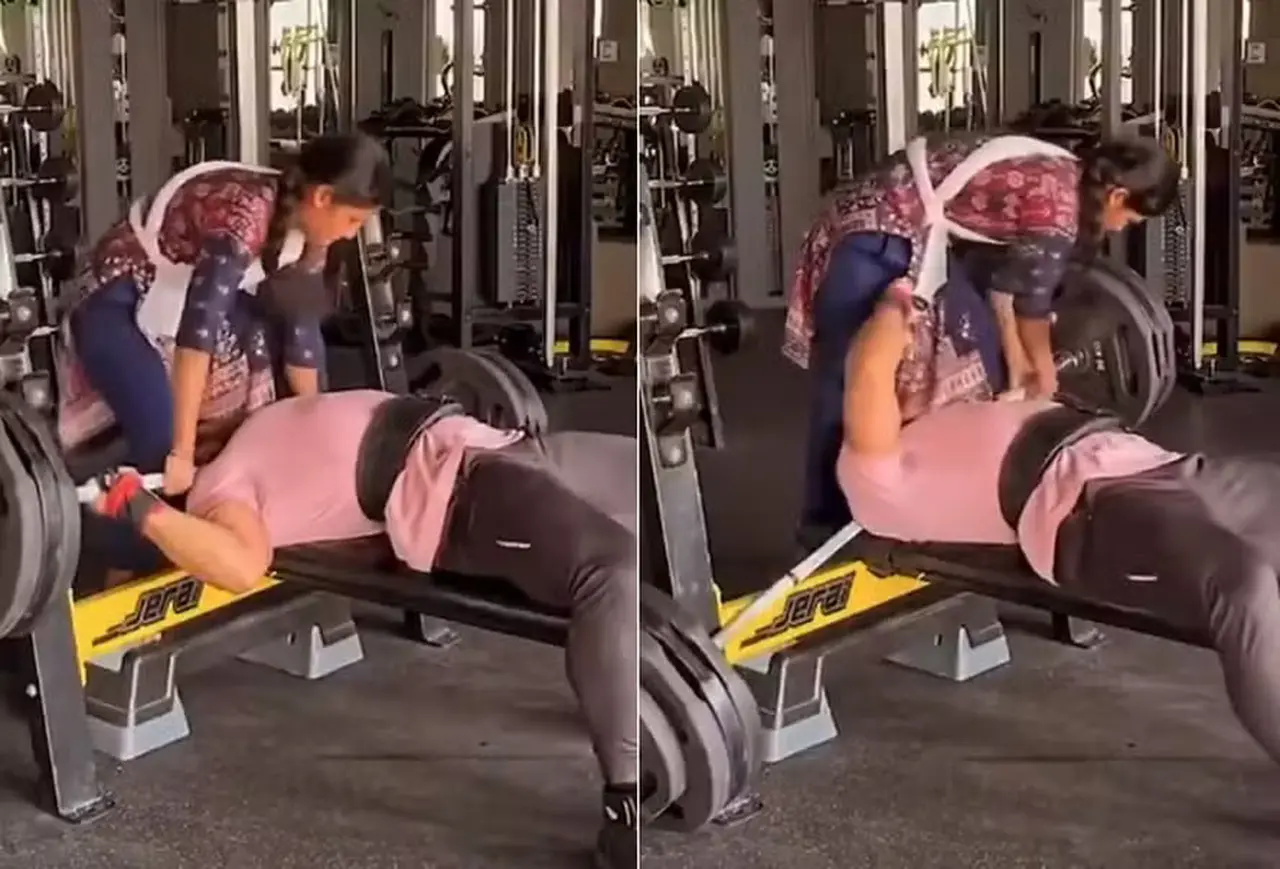 As imagens mostram o atleta deitado no banco, pronto para realizar o levantamento, enquanto a mulher que está atrás dele o auxilia na retirada da barra do suporte. Inicialmente, ele consegue baixar o peso de forma controlada, mas logo percebe que não tem força suficiente para erguer a carga de volta à posição inicial.