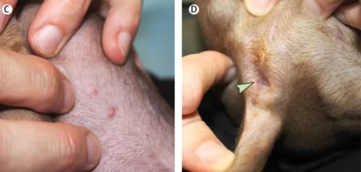 O cão da rala galgo italiano desenvolveu as lesões típicas da doença 12 dias após os tutores. Ele teve machucados muco cutâneos, como pústulas no abdômen e ainda uma ulceração anal "fina". As informações são do G1.