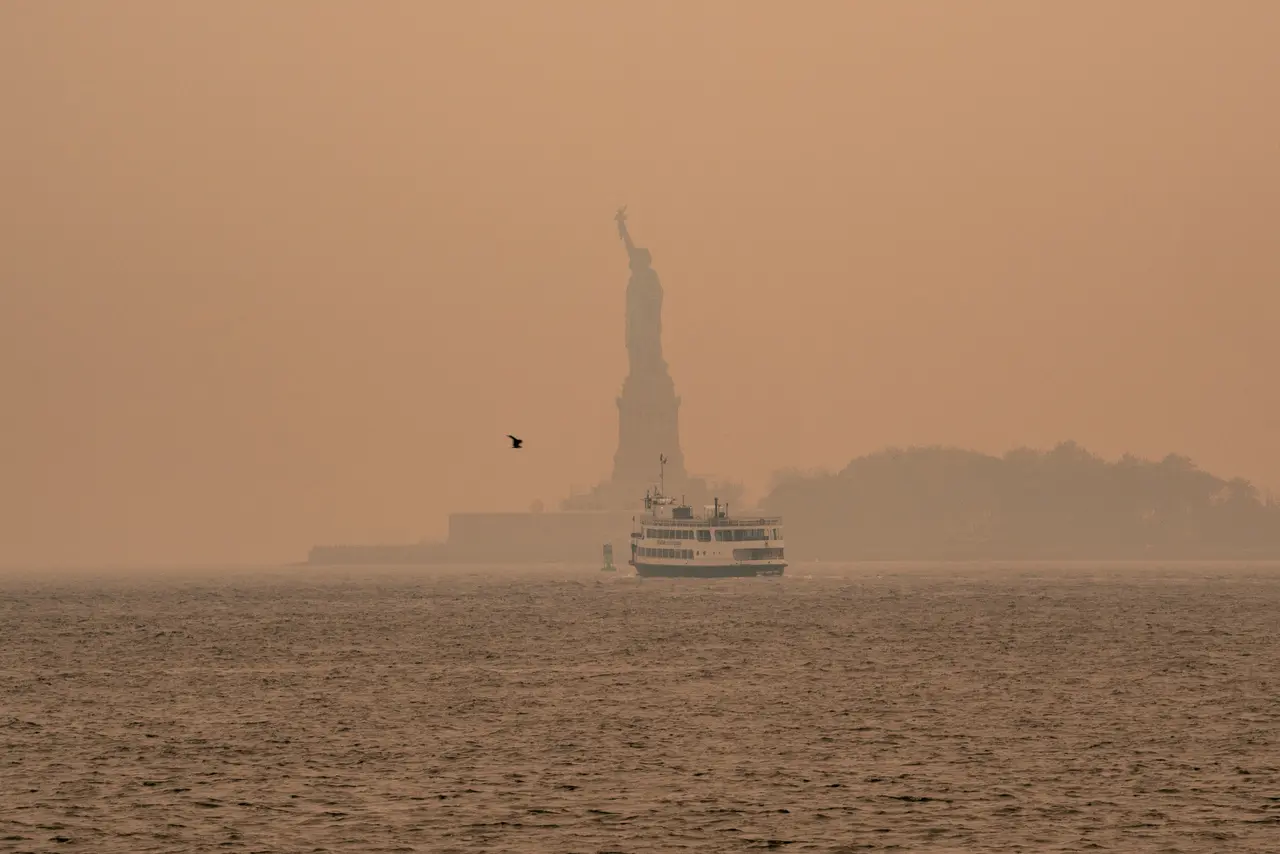 Em Nova Yorrk, a densa nuvem de fumaça envolveu a Estátua da Liberdade e o horizonte de Manhattan. Máscaras são distribuídas gratuitamente para a população se proteger da baixa qualidade do ar.