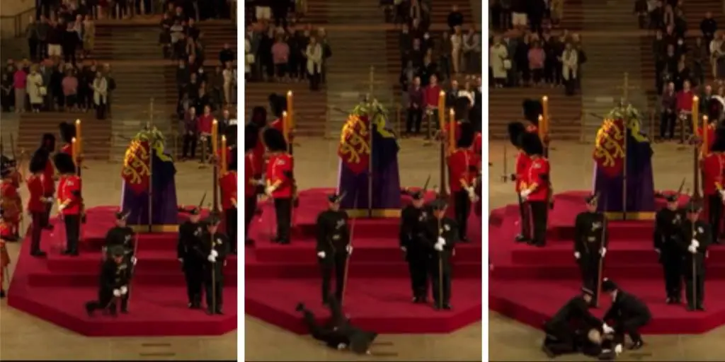 O episódio foi exibido ao vivo pela BBC, que transmitia a cerimônia de despedida da monarca. Nas imagens, é possível observar o homem cambalear e tentar ficar em pé no altar, mas, segundo depois, ele despenca e cai com o rosto no chão diante dos milhares de fãs que prestavam as últimas condolências ao corpo da nobre.