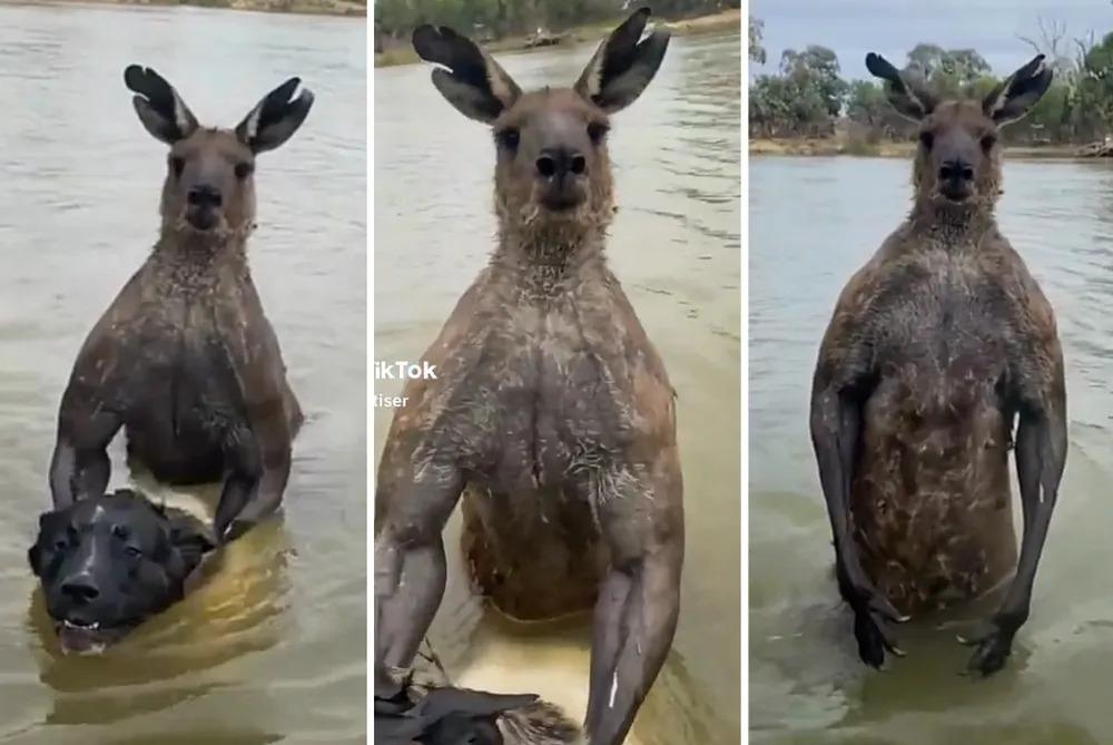 Homem briga com canguru 'maromba' para salvar cachorro de afogamento na Austrália