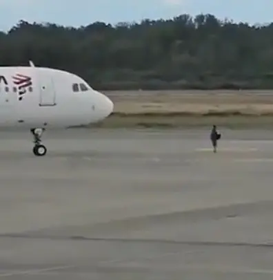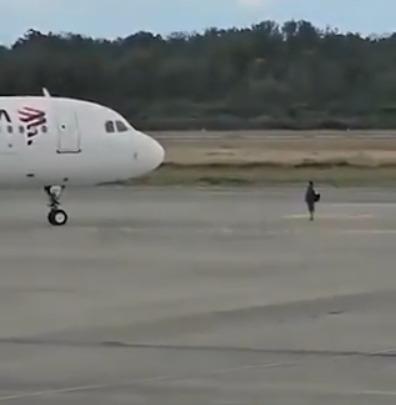 Um vídeo do momento mostra o homem correndo na pista das aeronaves. Ele ficou parado em frente ao avião, na tentativa de bloquear o início do voo.