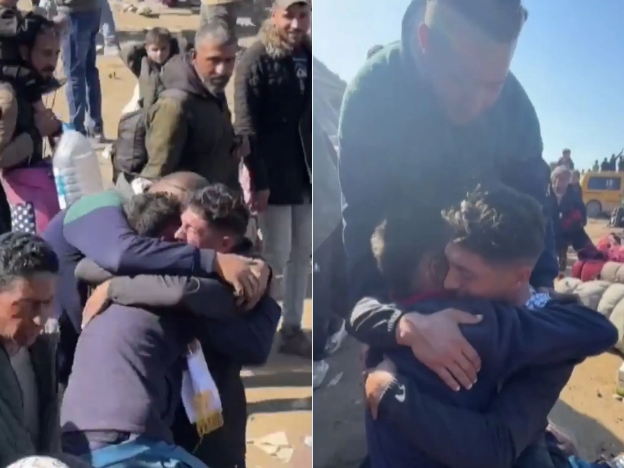 Como mostram vídeos que circulam nas redes sociais, os dois se emocionam e compartilham um longo abraço, enquanto milhares de palestinos se deslocam a pé na região após o acordo de cessar-fogo.