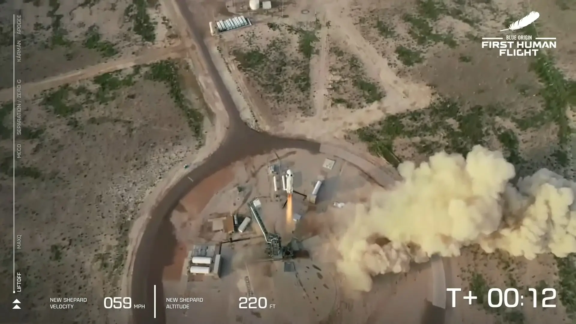 Após a decolagem, a New Shepard acelerou no espaço a velocidades superiores a Mach 3, usando um motor de hidrogênio/oxigênio líquido sem emissão de carbono.