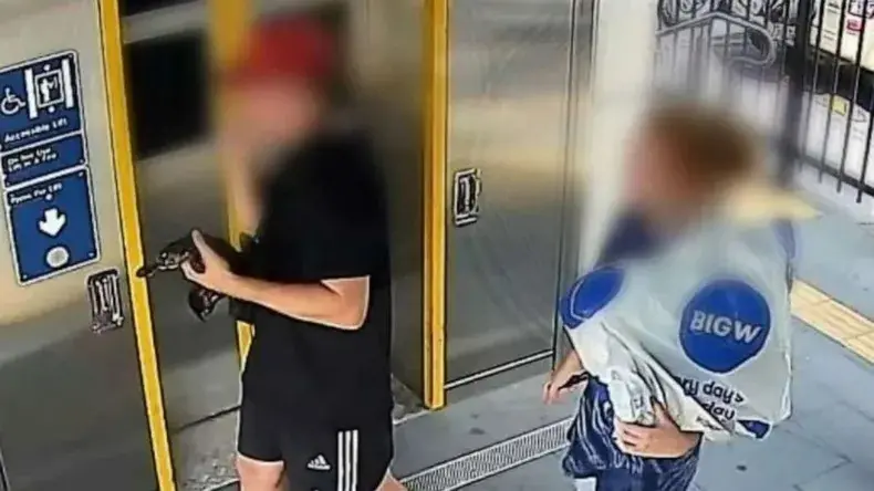 Imagens de um circuito interno de videovigilância gravadas na terça-feira (4) mostram um homem caminhando pela plataforma de uma estação no norte de Brisbane e acariciando o animal debaixo do braço.