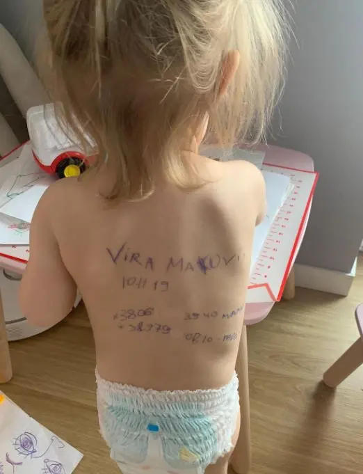 Ao compartilhar a imagem da menina com os dados pessoais escritos nas costas, a mãe, também chamada de Sasha, explicou que a imagem mostra o retorno da criança no primeiro dia de guerra. "Assinei com as mãos tremendo muito".