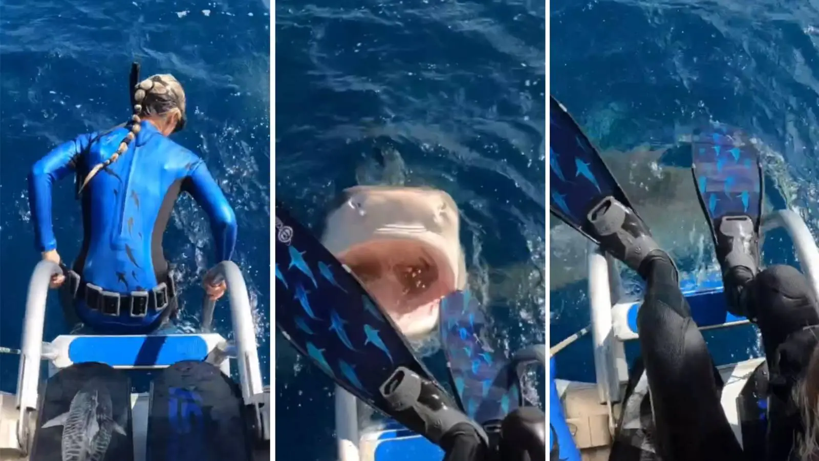 Nas imagens, é possível observar o momento em que a mulher está na escada da embarcação, se preparando para mergulhar, nos arredores da ilha de Oahu. No entanto, ao curvar o corpo sobre a água, ela avista o tubarão-tigre vindo na direção dela. A espécie é considerada uma das mais perigosas do mundo.