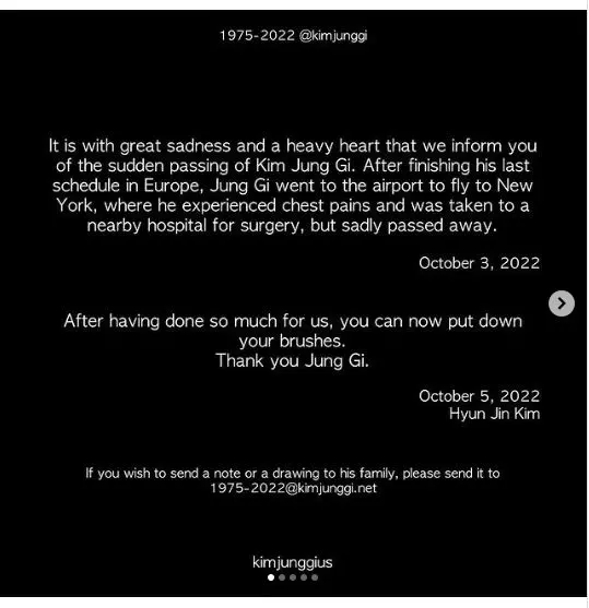 A informação foi repassada por um comunicado postado no Instagram de Kim. Segundo o relato, o artista estava em um aeroporto em Paris quando começou a sentir dores no peito. Internado rapidamente, ele morreu pouco depois de infarto fulminante.