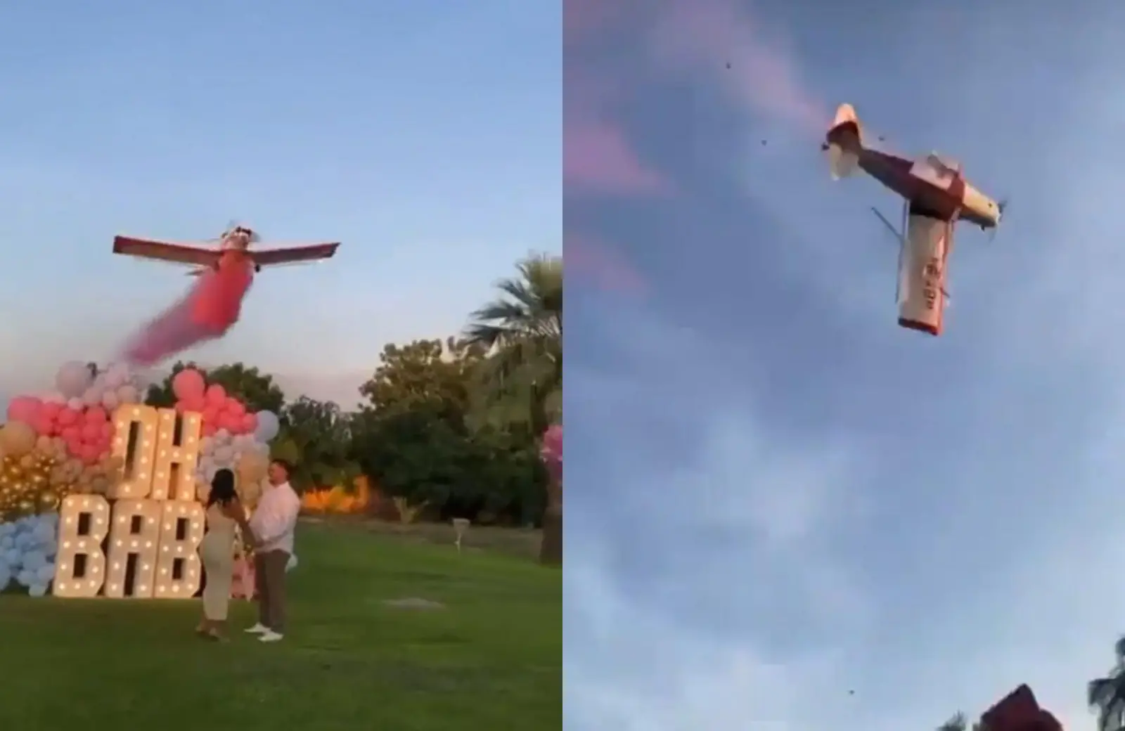 Em imagens registradas por pessoas que participavam do "chá revelação", é possível ver o avião fazendo um voo rasante, próximo a onde estavam os pais do bebê, na hora de soltar a fumaça rosa.