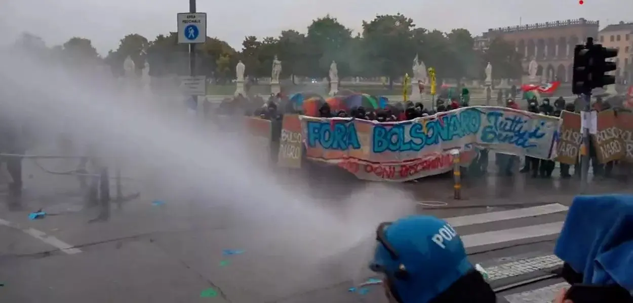 A polícia italiana respondeu com repressão a protestos contra o presidente brasileiro, Jair Bolsonaro (sem partido), que acontecem nesta segunda-feira (1º), em Pádua, na Itália. Vídeos veiculados pela imprensa do país mostram o uso de cassetetes, jatos de água e bombas de gás lacrimogêneo para dispersar os manifestantes.