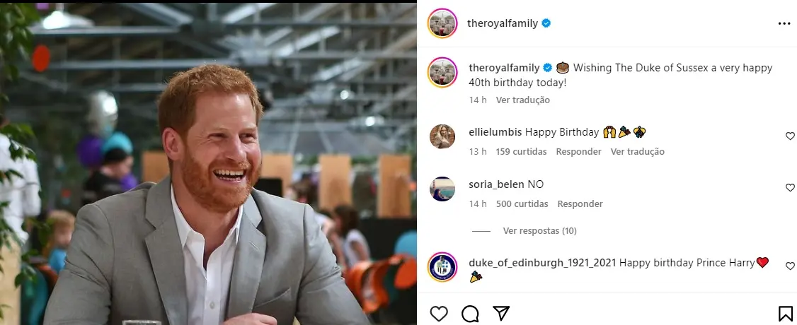 O post da família real diz: "Desejo ao Duque de Sussex um feliz aniversário de 40 anos hoje!" com uma foto de Harry. Apesar da mensagem, o jornal "The Guardian' afirma que ele continua afastado de seu irmão, príncipe William.