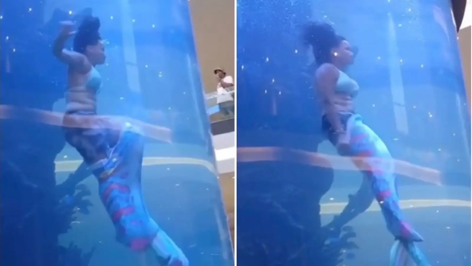 Sereia profissional fica presa em aquário de shopping e tenta fugir de afogamento; veja vídeo