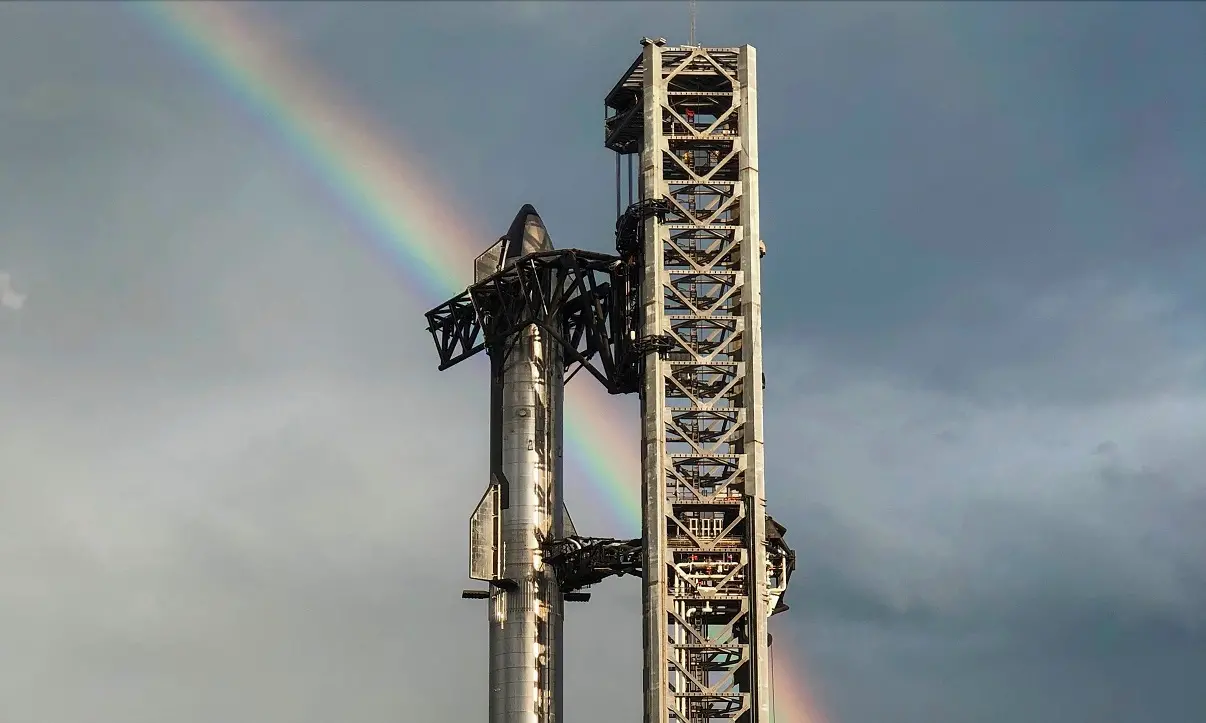 O sistema com um total de 112 metros de altura já está montado na base Starship, no Texas, nos Estados Unidos.