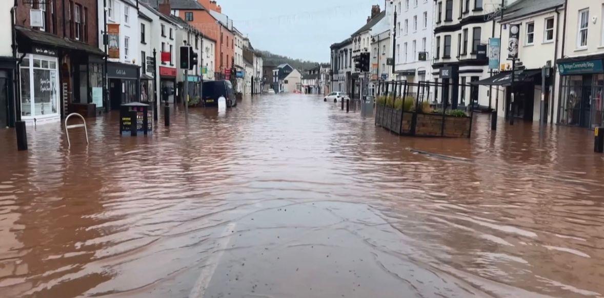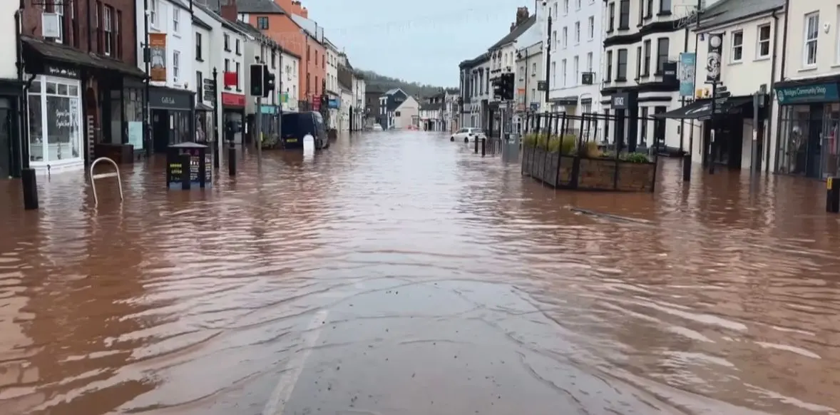Um rio chegou a transbordar e imagens aéreas mostram a água atingindo o centro da cidade e regiões residenciais. Áreas da Irlanda também foram impactadas.