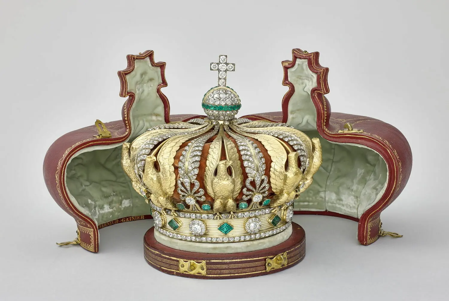 Única joia recuperada após o roubo, a coroa da imperatriz Eugênia é adornada por oito arcos em forma de águia. O globo central é adornado por 32 esmeraldas e encimado por uma cruz de seis brilhantes. Ao todo, a peça contém 1.354 diamantes, 1.136 rosas e 56 esmeraldas.