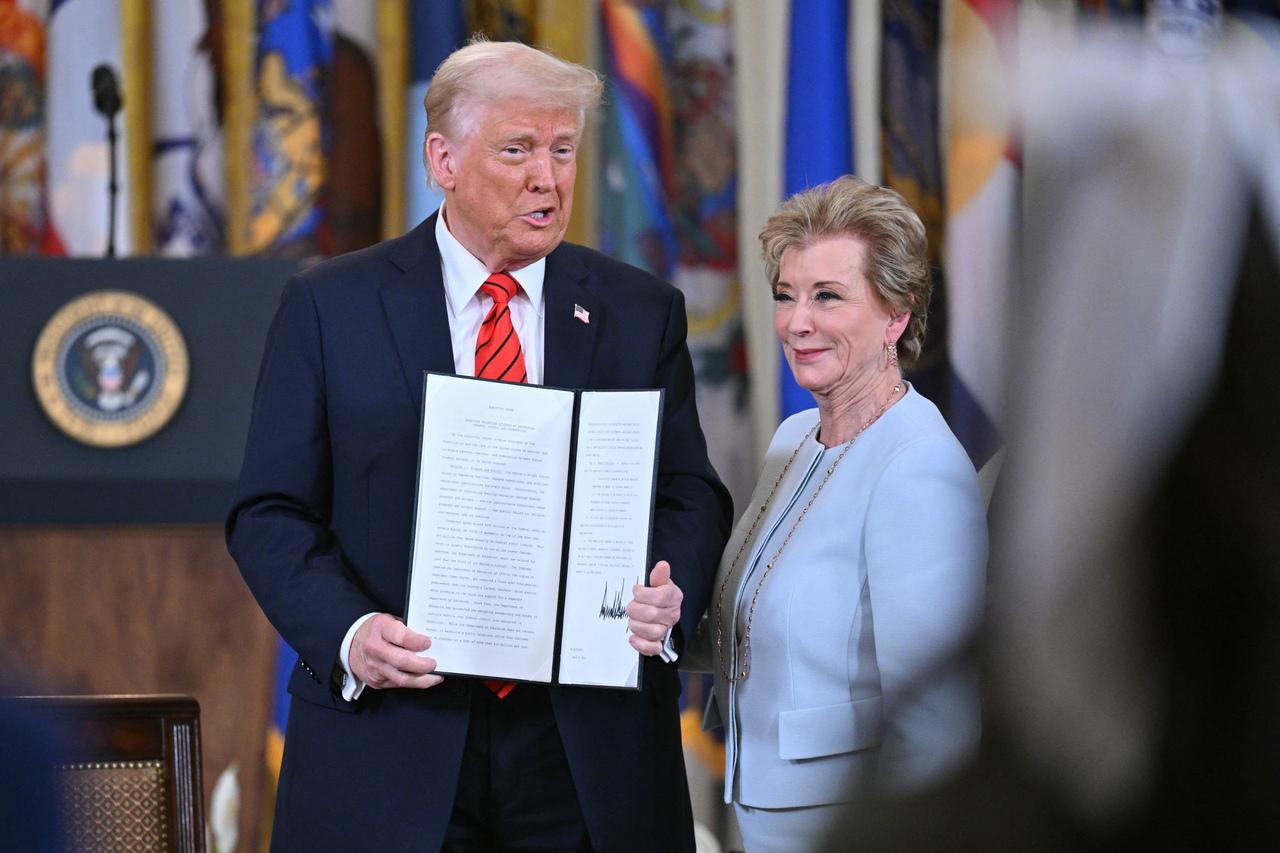 Cercado de estudantes sentados em carteiras escolares na Casa Branca, Trump posou segurando o decreto, que "começará a eliminar o Departamento de Educação federal de uma vez por todas", declarou. "Vamos fechá-lo o mais rapidamente possível. Não está nos fazendo bem algum. Vamos devolver a educação aos estados."