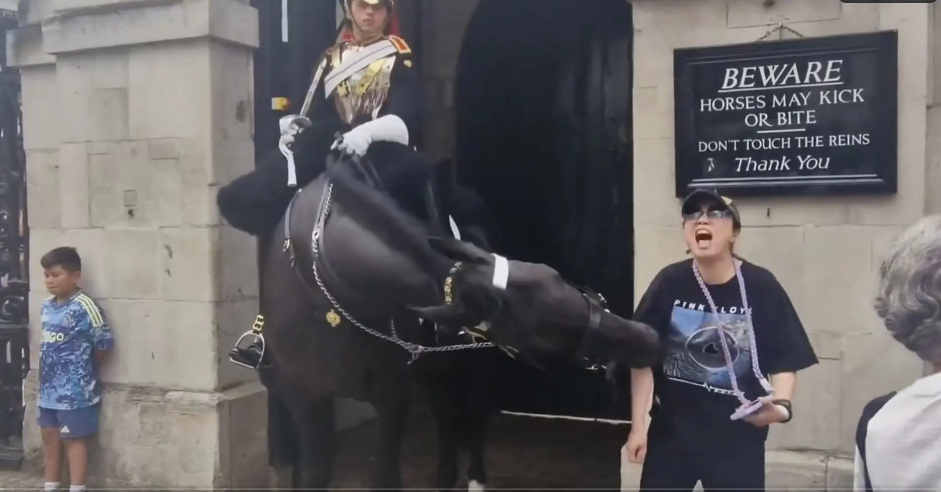 Uma mulher foi mordida no braço por um cavalo da Guarda Real ao tentar tirar uma foto com o animal em Londres, na Inglaterra. O incidente aconteceu do lado de fora do Palácio de Buckingham, e as cenas foram registradas por vários turistas.