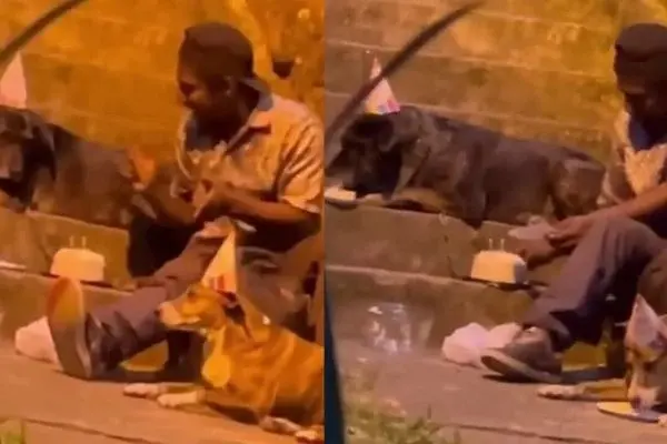 Vídeo de morador de rua cantando parabéns com cachorros emociona e viraliza nas redes sociais
