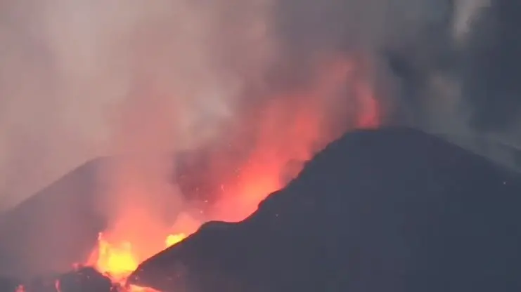 Um colapso vulcânico ocorrido neste sábado (9) enviou uma onda de lava vermelha do cume Cumbre Vieja. O fluxo rápido com pedaços de lava endurecido destruiu um parque industrial próximo ao local.