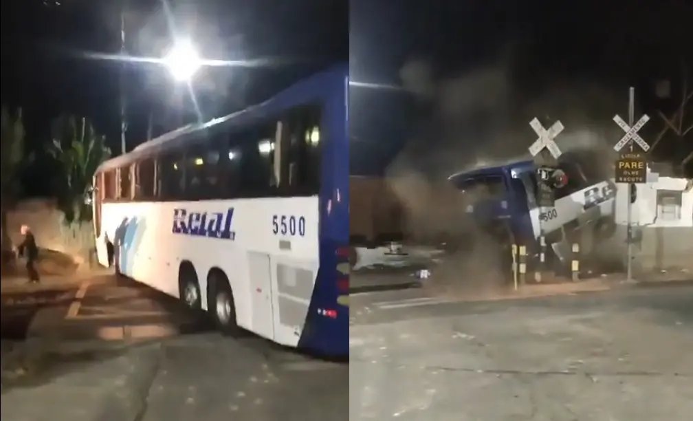 Um ônibus de turismo foi atingido por um trem, no Bairro Retiro, em Juiz de Fora (MG), na noite de domingo (28). Com o impacto, o veículo foi partido ao meio. As informações são da TV Integração, afiliada da TV Globo em Minas Gerais.