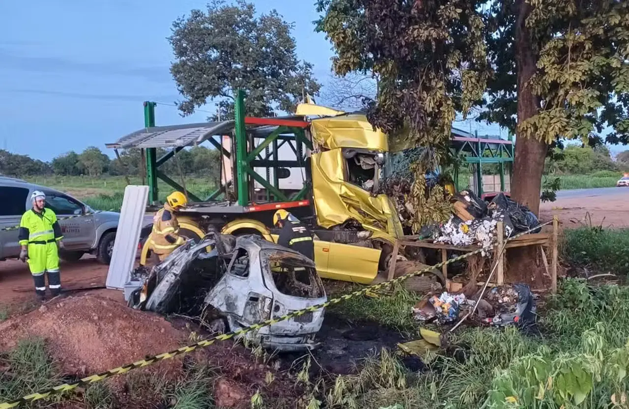 Carro com as vítimas teria incendiado logo após colidir com uma carreta cegonha.