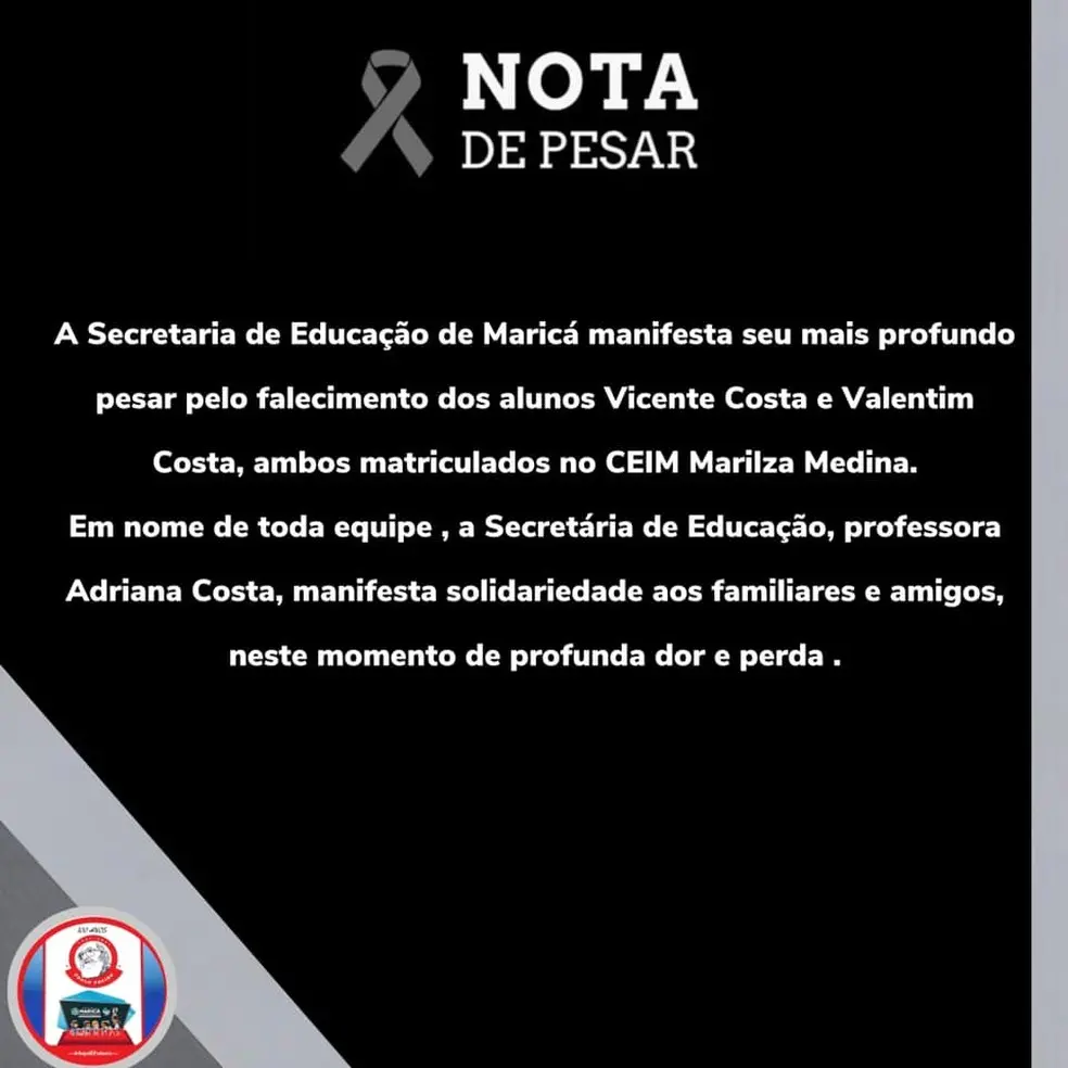 "A Secretaria de Educação de Maricá manifesta seu mais profundo pesar pelo falecimentos dos alunos Vicente Costa e Valentim Costa, ambos matriculados no Ceim Marilza Medina. Em nome de toda equipe, a secretária de Educação, professora Adriana Costa, manifesta solidariedade aos familiares e amigos, neste momento de profunda dor e perda".