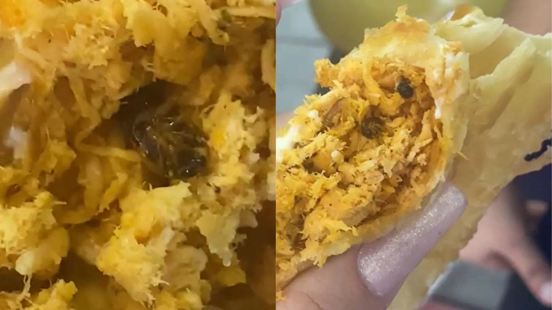 Em imagens feitas pela jovem é possível o alimento já com algumas mordidas e pedaços de baratas entre os ingredientes.