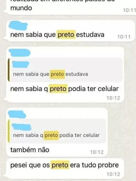 Os ataques ocorreram em um grupo de WhatsApp chamado "Pilantrinhas (sem neguin)"