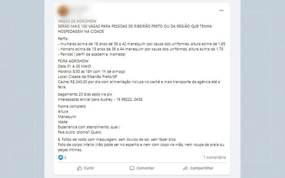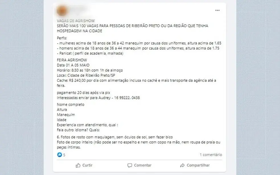 Um anúncio de vagas de emprego repercutiu nas redes sociais ao exigir mulheres com "perfil de academia" e "panicat". O trabalho é na Agrishow, uma feira de tecnologia agrícola que ocorre entre 1º e 5 de maio em Ribeirão Preto (SP).