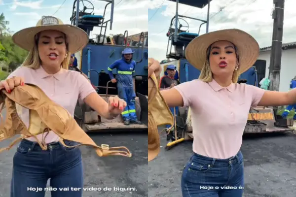 Na sequência do vídeo, Patrícia responde com ironia: “Não vai ter vídeo de biquíni”, antes de cortar para imagens em que aparece ajudando os operários. Ela surge operando uma máquina pesada e, depois, sentada em uma calçada comendo pão com margarina ao lado dos trabalhadores.