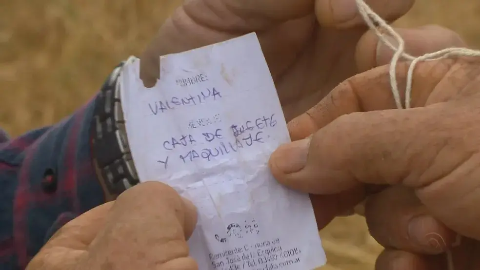 No papel escrito em 20 de agosto último, Valentina, de 4 anos, pediu uma “caixa de brinquedos e maquiagem” e anotou informações para ser localizada. No dia 26 de agosto, ao sair para trabalhar, o agricultor Vilson Becker Gehringara encontrou o balão com o bilhete acoplado no barbante.