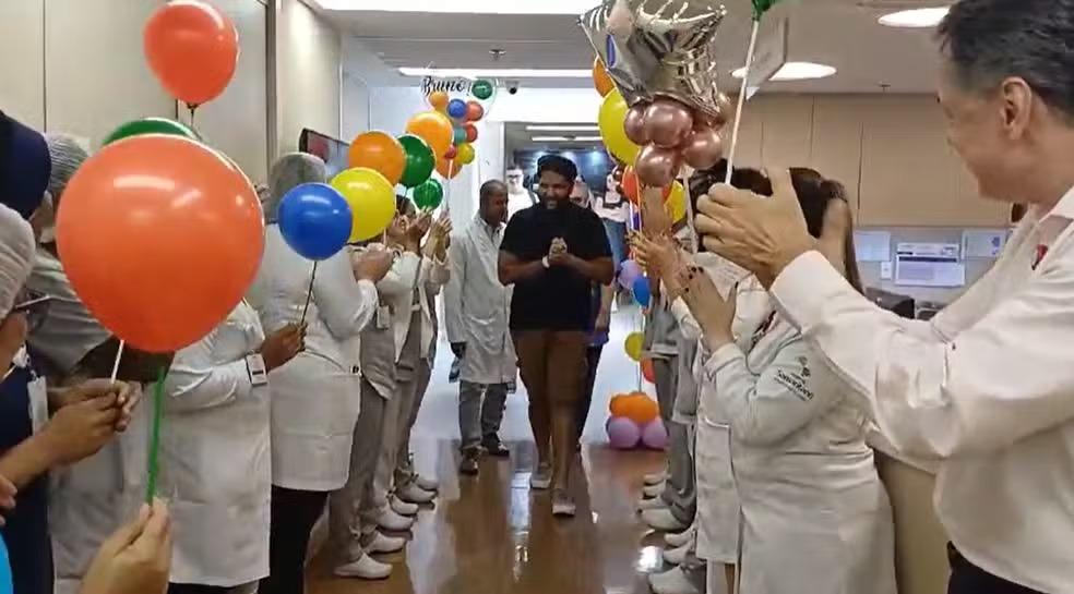 Sob aplausos da equipe médica, o sobrevivente deixou o hospital andando e conversando. Bruno agradeceu o cuidado dos profissionais durante sua internação.