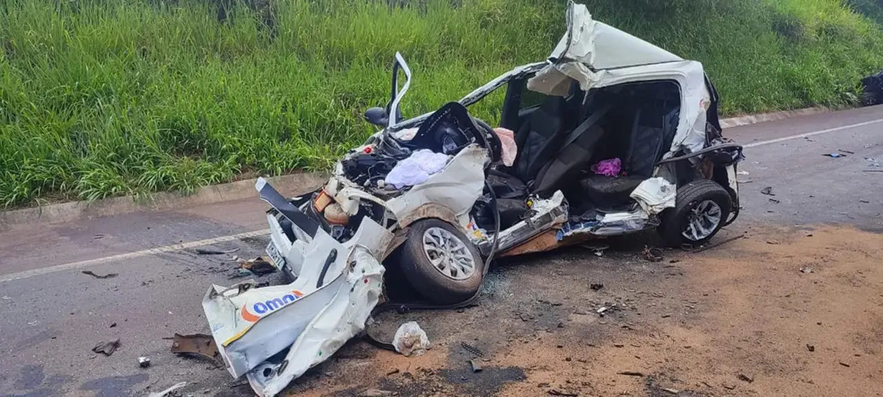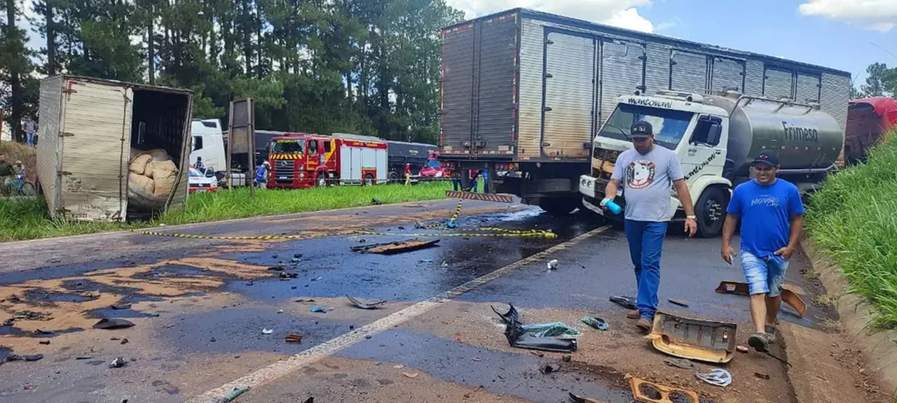 Um dos veículos ficou completamente destruído com o impacto da batida e um dos caminhões envolvido invadiu parte da pista contrária.