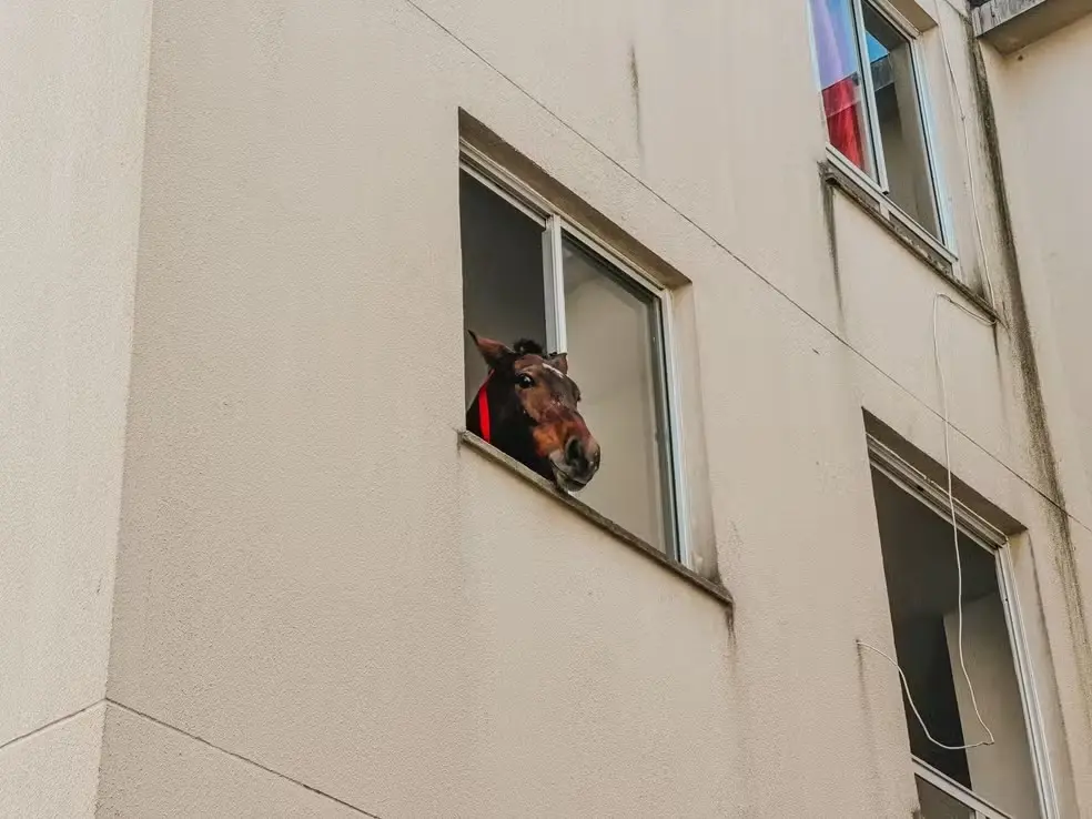Um cavalo ficou preso no terceiro andar de um edifício de um condomínio residencial em São Leopoldo, no Vale dos Sinos, no Rio Grande do Sul. O Corpo de Bombeiros da região foi acionado, nesta terça-feira (14), e resgatou o animal, que estava ilhado no local há 10 dias, segundo o síndico do prédio.