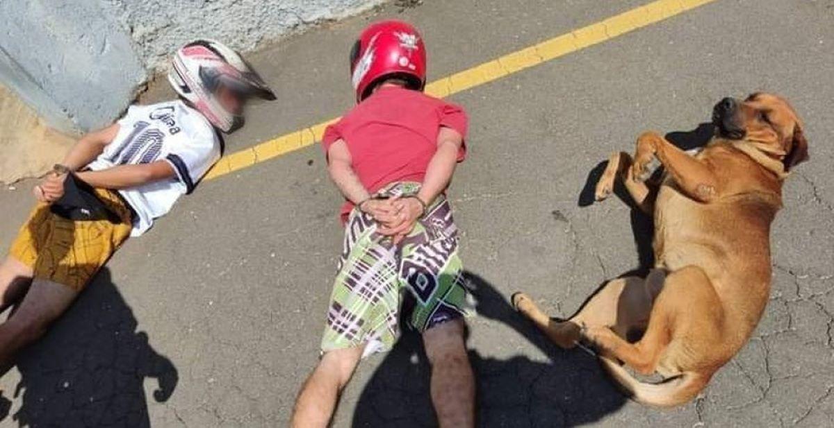 Um cachorro que passava pela rua no momento de uma abordagem policial chamou atenção após se deitar no chão com dois suspeitos em Itaperuçu, Região Metropolitana de Curitiba (PR). O cão deitou de bruços e encolheu as patas, em um gesto considerado como "solidário".