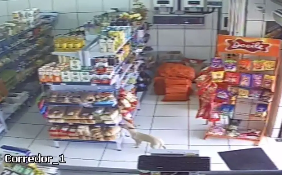 Nas imagens da câmera externa, o animal atravessa a rua e entra sorrateiramente no estabelecimento. Na filmagem interna, a cadela se aproxima de uma prateleira, puxa uma sacola do alimento e corre com o produto na boca.