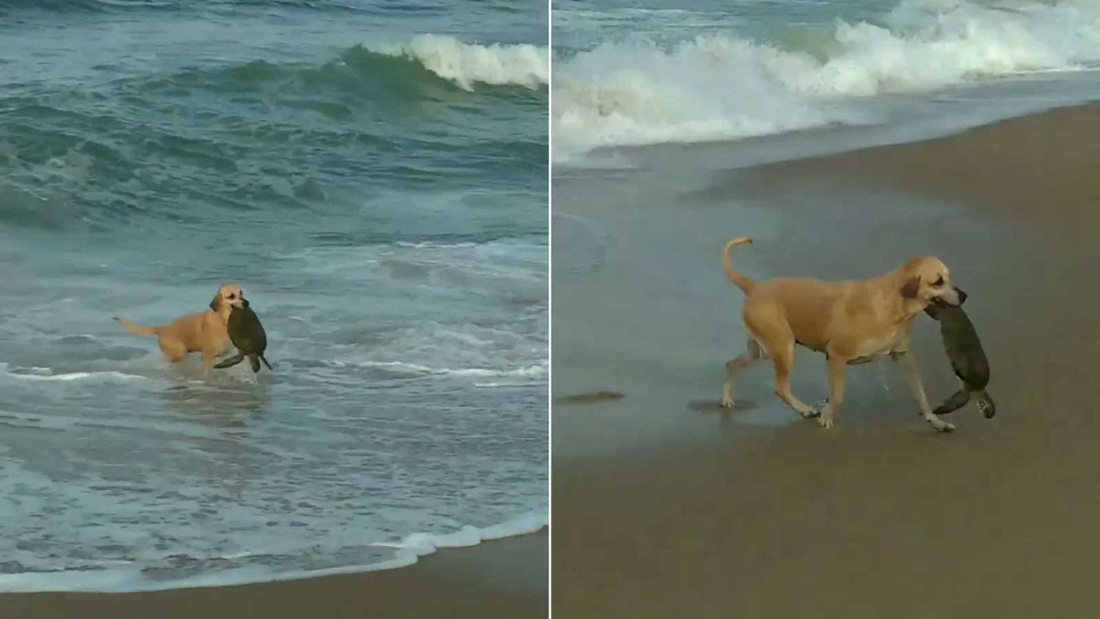 Cadela salva tartaruga em praia de Santa Catarina e viraliza nas redes sociais