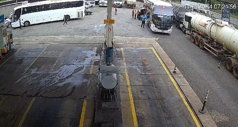 Em seguida, com o impacto, o motorista também atinge outro ônibus de viagem parado na área externa do posto de gasolina, que fica às margens da pista.