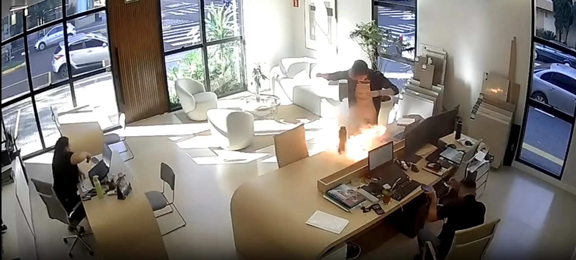 Uma câmera de segurança registrou o momento em que um celular explodiu enquanto estava carregando. O caso aconteceu na quarta-feira (8), em um escritório de arquitetura em Toledo, no Paraná.