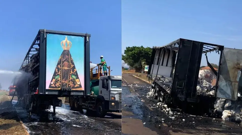 Carreta de algodão pega fogo, e painel de Nossa Senhora Aparecida fica intacto