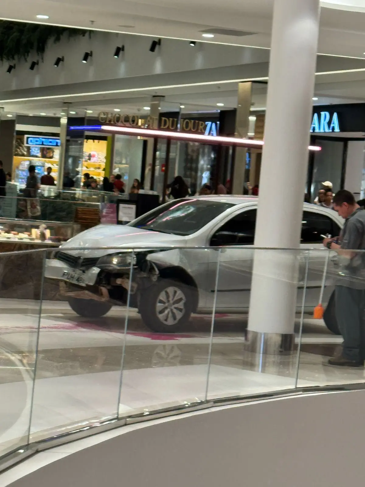 Segundo frequentadores, o caso aconteceu por volta das 20h45. Nas imagens registradas por câmeras de segurança, é possível ver o carro invadindo o shopping por uma porta de vidro, entre uma farmácia e um restaurante.