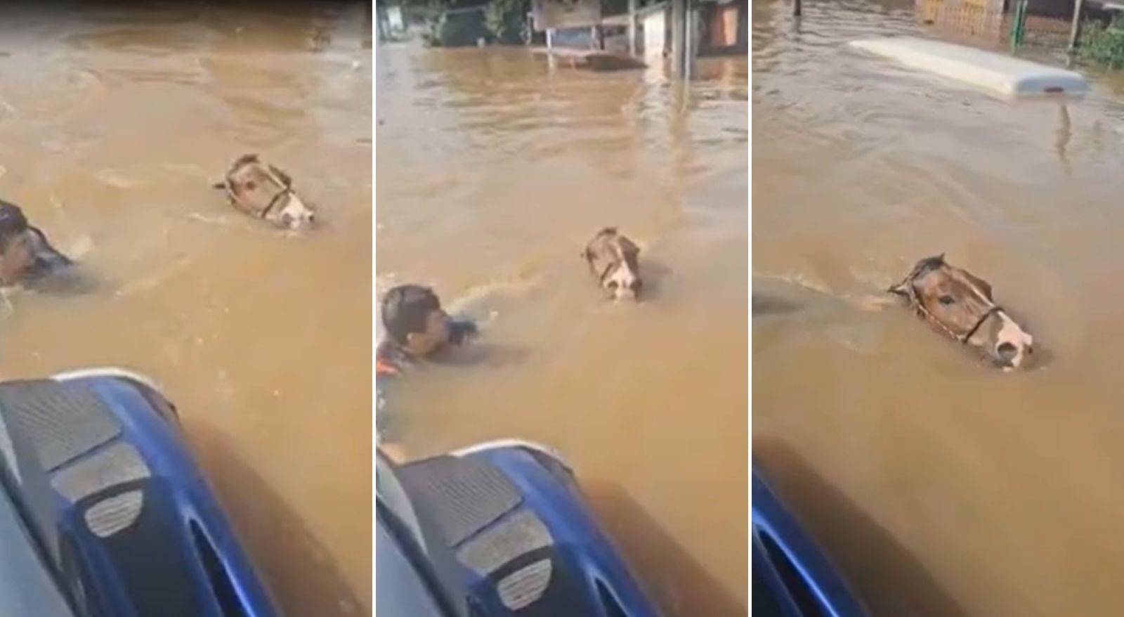 O gestor, que já foi domador de equinos, salvou o animal enquanto atuava junto as equipes de resgates. Na cidade, mais de 50 mil pessoas vivem em áreas de risco, 15 mil foram levadas para 55 abrigos abertos e 11 bairros foram evacuados em razão das enchentes, conforme o g1.