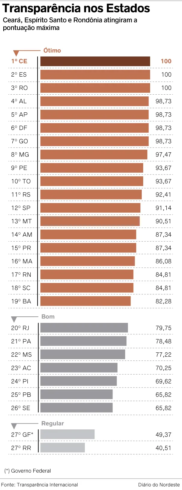 No estudo, o Governo Federal registrou 49,3 pontos de 100, classificado como “regular”. Só ficou acima de Roraima, com 40,51 pontos.