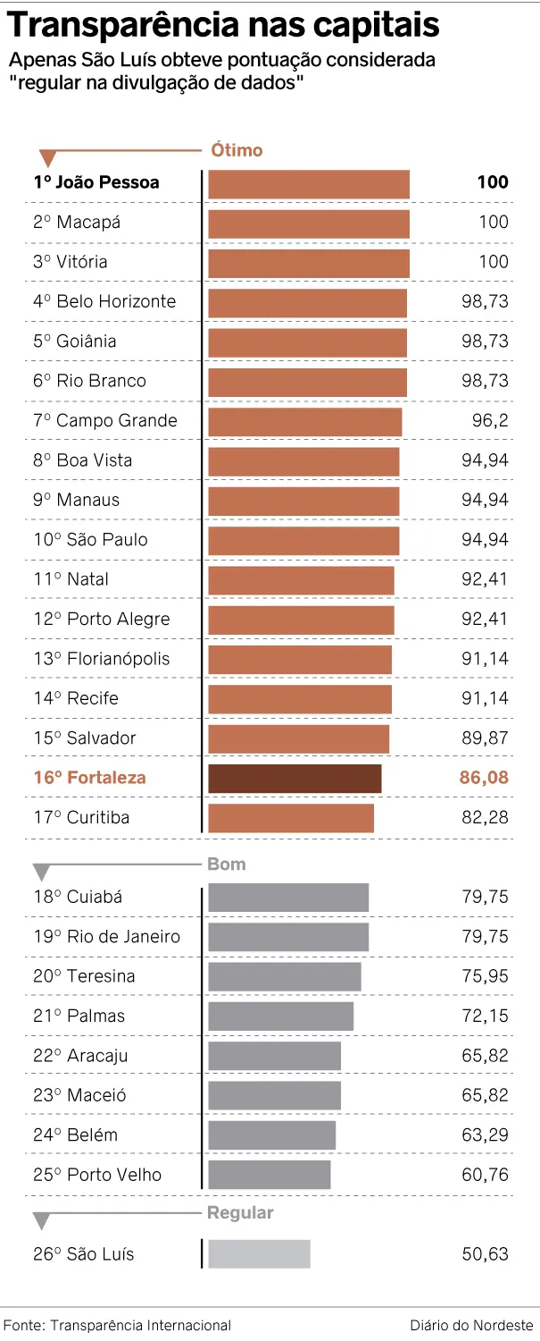 No ranking das capitais, Fortaleza começou em 4º lugar, depois caiu para 9º e agora está em 16º, com 86,08 pontos, com desempenho considerado "ótimo" pelo ranking.