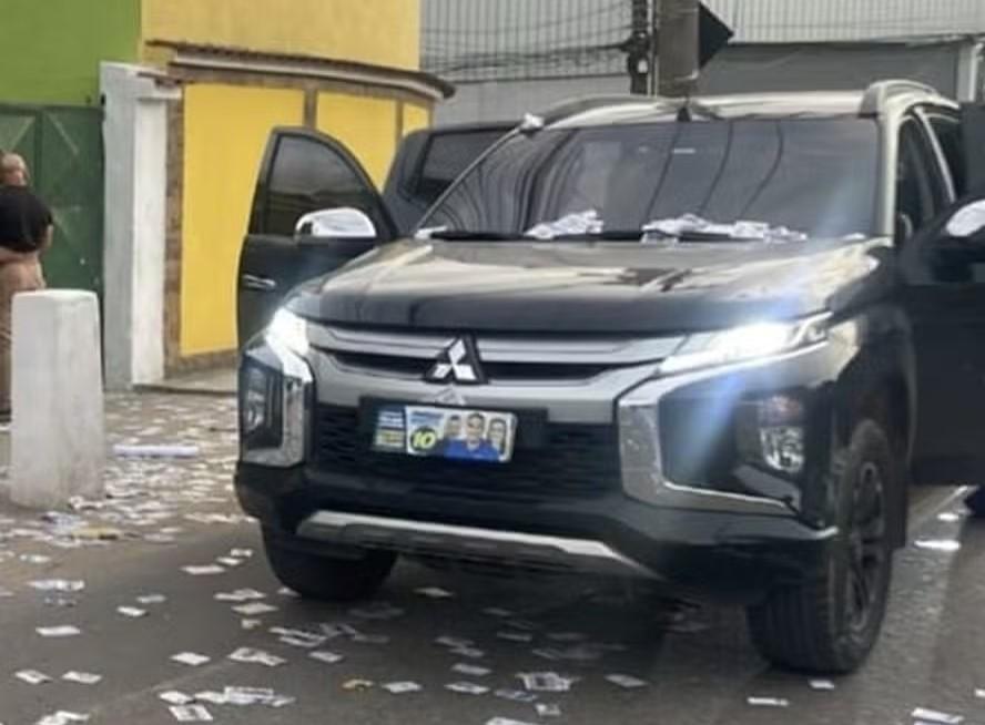 O carro onde os policiais estavam tinha a placa coberta por um adesivo do candidato a prefeito Matheus do Waguinho (Republicanos). Por conta da infração, uma quarta pessoa foi presa junto ao trio por crime de adulteração de sinal de identificação de veículo.