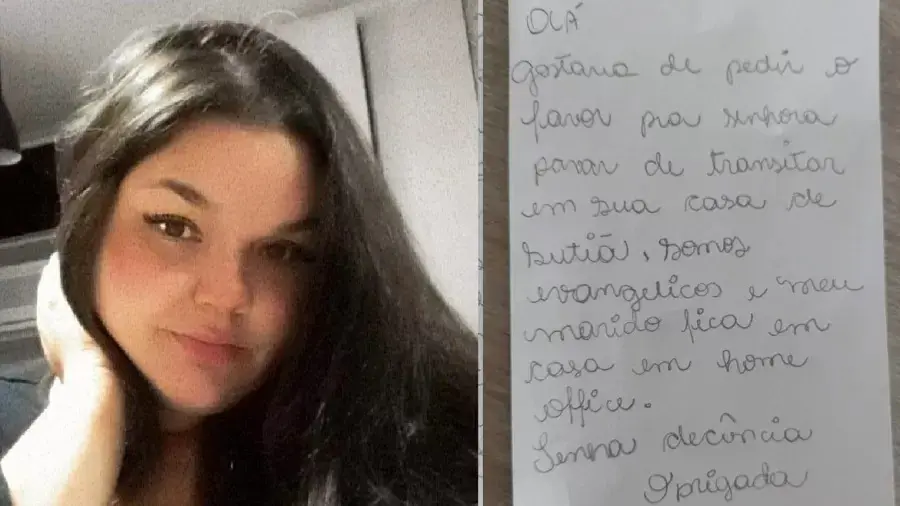 Moradora de Osasco, na Grande São Paulo, a confeiteira Juliana Kulpa, 25, recebeu na caixa de correspondências um bilhete em que a vizinha pede para ela parar de andar em casa apenas de sutiã porque a família é evangélica e o marido está em home office. "Tenha decência", advertiu a mulher à Juliana.