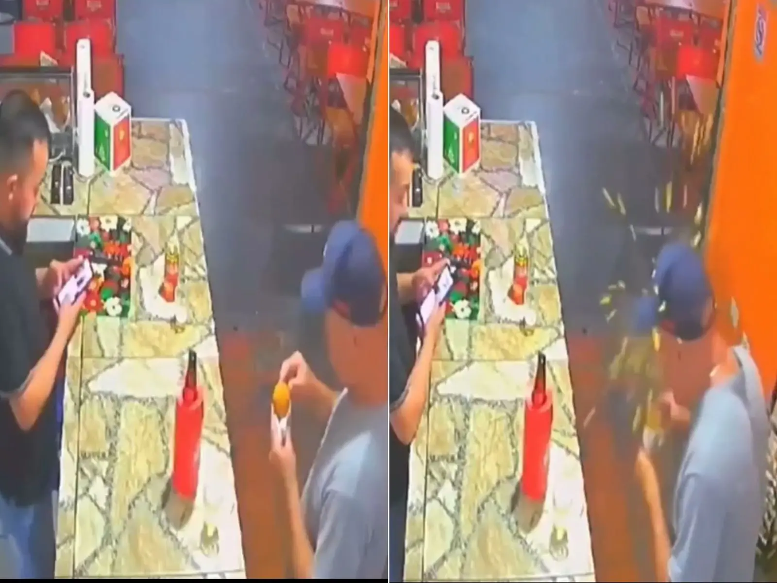 De acordo com o dono do estabelecimento, Christian de Souza Amaral, o homem teve queimaduras superficiais na boca e no rosto. "Parecia ser um barulho de pneu estourando (...). Fiquei em estado de choque vendo a massa grudar no rosto dele, em mim... Parecia uma bomba", relatou ao g1.