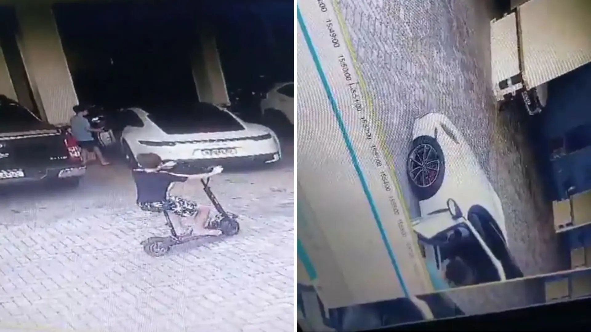 Após a batida, o menino desce da Porsche, olha para a traseira e sai correndo. Ele ainda volta para buscar a bicicleta que havia deixado logo ao lado, no estacionamento. Outra criança presenciou o acidente, mas seguiu andando em um patinete.